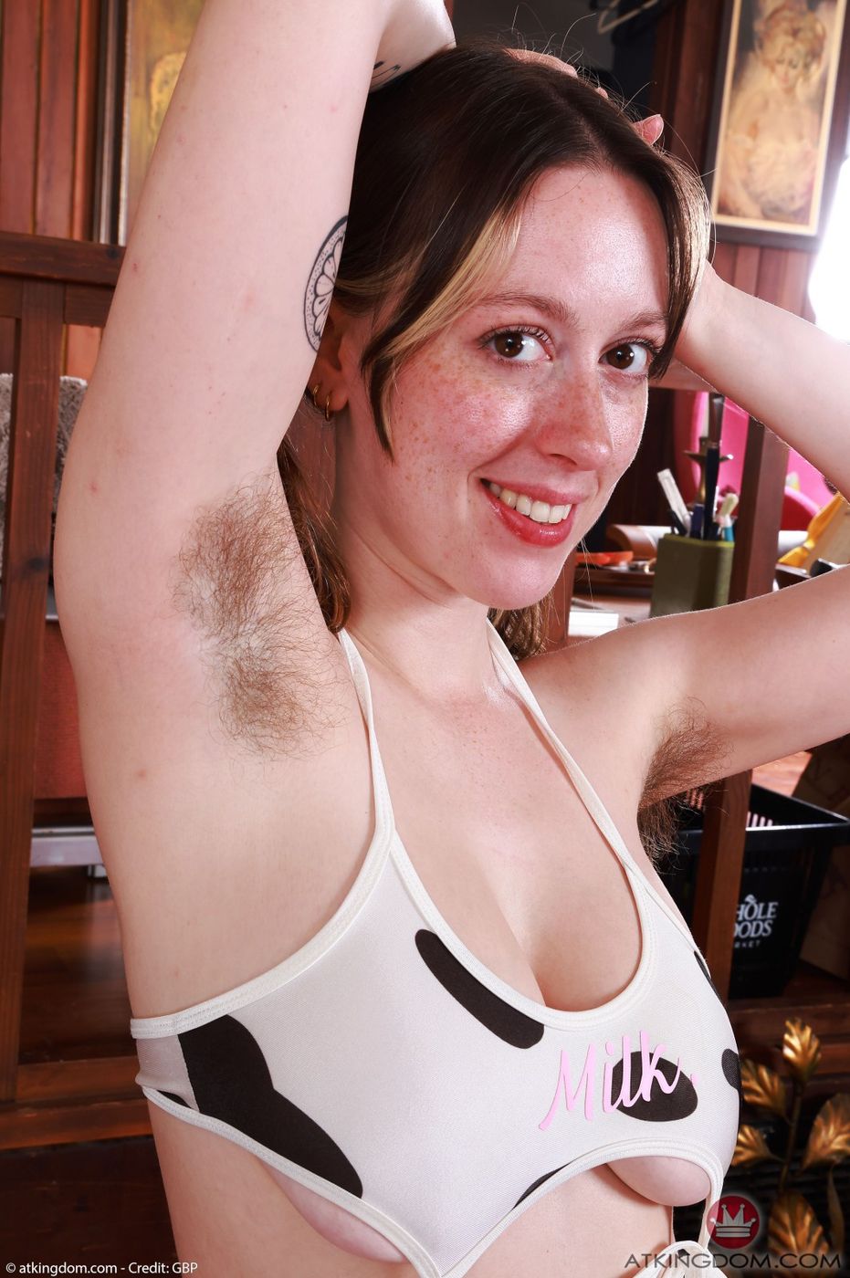 ATK Natural & Hairy: Big Eyes with the cow print dress and stockings