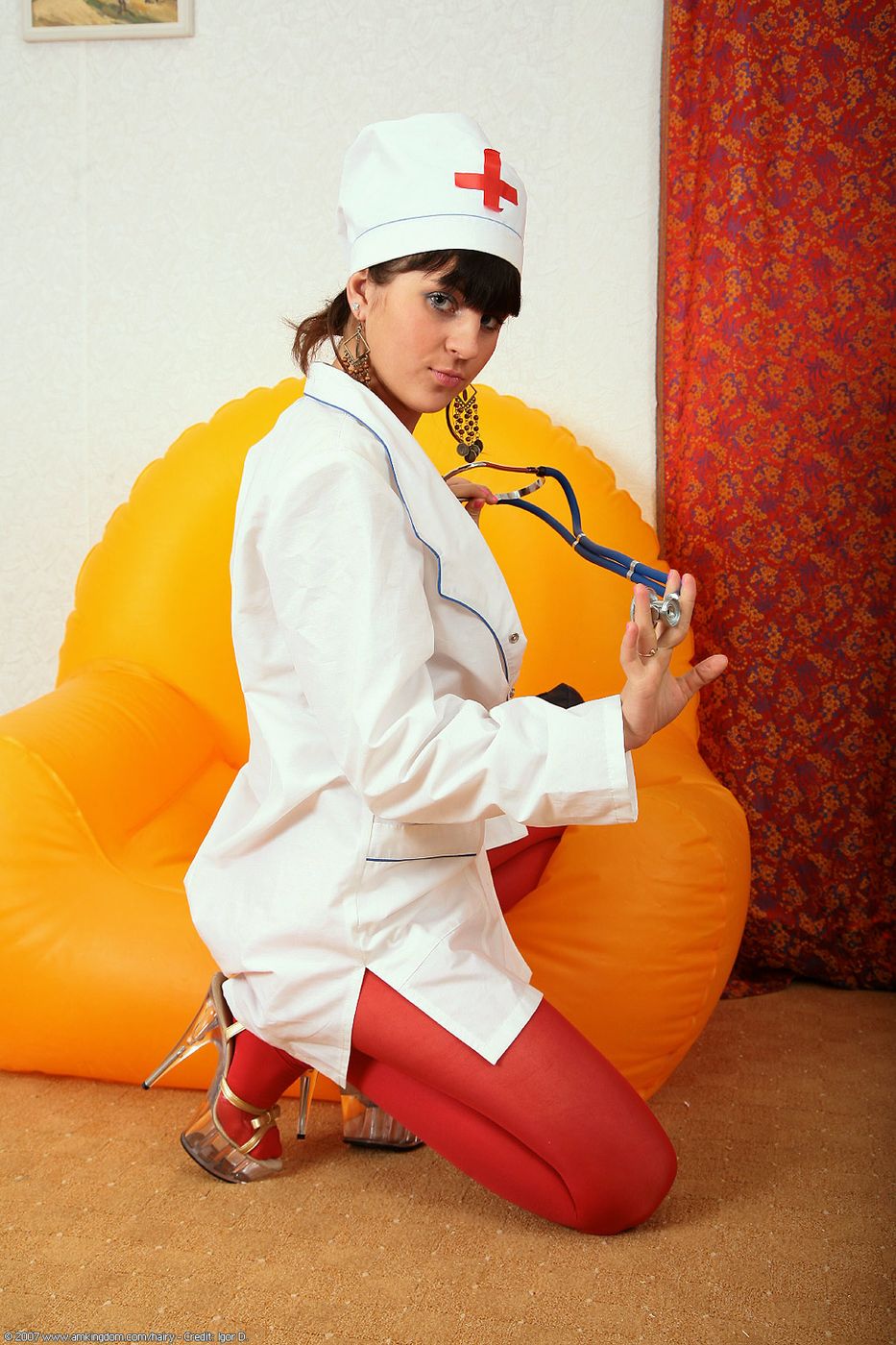 - Description: Nadya has some sexy thigh highs that frame out her hairy pussy, as she plunges a red vibrator into her bush.